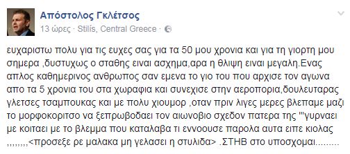 Πολύ δύσκολες ώρες για τον Απόστολο Γκλέτσο μία ημέρα μετά την ονομαστική του εορτή . Μόλις χθες δεχόταν χρόνια πολλά και ευχές για την γιορτή του ενώ σήμερα δέχεται συλλυπητήρια.