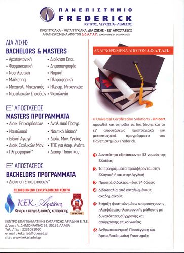 Το Κέντρο Επαγγελματικής Κατάρτισης “ΑΡΙΑΔΝΗ” συμβάλλει και στοχεύει , μέσω των ειδικών συνεργασιών του, στην προώθηση μεταπτυχιακών προγραμμάτων του Πανεπιστημίου Frederick Κύπρου, αναγνωρισμένων από τον Δ.Ο.Α.Τ.Α.Π. και ομοταγή των Ελληνικών Α.Ε.Ι.