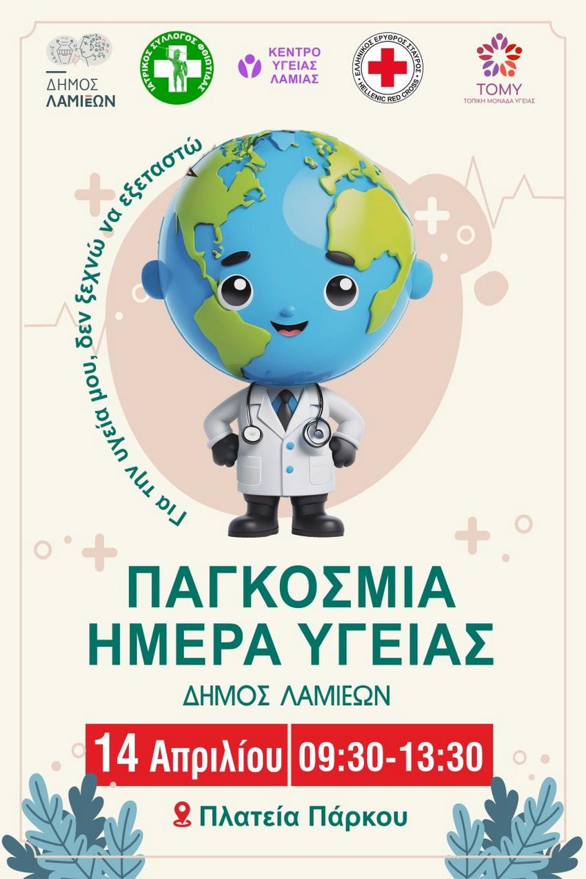 Ο Δήμος Λαμιέων ενημερώνει ότι η δράση με αφορμή την Παγκόσμια Ημέρα Υγείας θα πραγματοποιηθεί τη ΜεγάληΔευτέρα 14 Απριλίου, από τις 09:30 έως τις 13:30, στην Πλατεία Πάρκου.