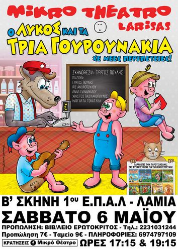 Πιστό στο ραντεβού του το ΜΙΚΡΟ ΘΕΑΤΡΟ ΛΑΡΙΣΑΣ έπειτα από τις τεράστιες επιτυχία που σημείωσε με τις παραστάσεις , Ο Λύκος και τα 7 Κατσικάκια ,Το Ασχημόπαπο & "Ο Βασιλιάς των Λιονταριών" σε όλη την Ελλάδα, συνεχίζει την παράδοση που δημιούργησε από το 2009 με τις ποιοτικές παιδικές παραγωγές του και έπειτα έρχεται για 7η χρονιά στην πόλη μας με το πασίγνωστο παραμύθι του James Halliwell-Phillipps Ο ΛΥΚΟΣ & ΤΑ ΤΡΙΑ ΓΟΥΡΟΥΝΑΚΙ ...ΣΕ ΝΕΕΣ ΠΕΡΙΠΕΤΕΙΕΣ