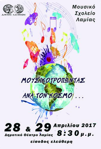 Ο Δήμος Λαμιέων και το Μουσικό Σχολείο Λαμίας σας προσκαλούν στην μουσικοθεατρική παράσταση «Μουσικοτροπώντας ανά τον κόσμο» που θα πραγματοποιηθεί την Παρασκευή 28 και το Σάββατο 29 Απριλίου και ώρα 8:30 μ.μ. στο Δημοτικό Θέατρο Λαμίας.